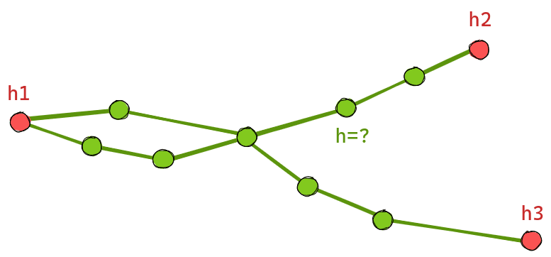 Es verbleibt die Frage, woher die hier als bekannt vorausgesetzten Höhenwerte innerhalb eines Tunnel/Brücken-Netzwerks kommen. Treten wir einen Schritt zurück und formulieren das Problem etwas abstrakter: Gegeben ein zusammenhängender, ungerichteter Graph mit bekannten Werten für die Höhe an gewissen Knoten (Eingänge) und bekannten Weglängen entlang der Kanten: Was ist eine gute Schätzung für die Höhenwerte an allen Knoten, die keine Eingänge sind? Für einen einfachen Tunnel mit nur zwei Eingängen liegt die Lösung auf der Hand: Linear zwischen beiden Eingängen entlang der Wegstrecke interpolieren. Doch was ist eine gute Verallgemeinerung für Tunnelsysteme mit mehr als zwei Eingängen und Kreuzungen/Weichen, welche in der Realität sehr häufig auftreten?