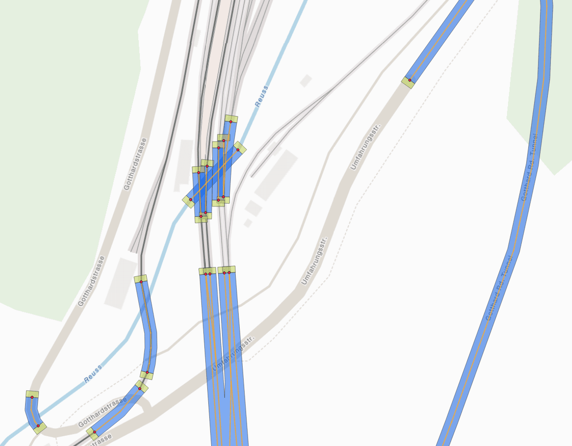 Bei der Erkennung muss berücksichtigt werden, dass mehrere Netzwerk-Polygone sich überlappen können (zum Beispiel bei teils parallelen Tunneln für Hin- und Rückrichtung). Ferner kann eine Route ein Netzwerk-Polygon schneiden, ohne durch einen Eingang zu fahren, zum Beispiel bei einer Straße, die unter einer Brücke hindurch führt. Es ist also wichtig, dass sowohl der Verlauf des Tunnels oder der Brücke als auch die dazugehörigen Eingänge im Entscheidungsprozess berücksichtigt werden. Für die Auflösung von Konflikten bei mehreren möglichen Tunneln verwenden wir einen iterativen Ansatz, welcher es erlaubt, Cluster sich gegenseitig überlappender Netzwerke mittels eines Rankings schrittweise aufzulösen. Als Messgröße für das Ranking dient hierbei der Abstand der Route zu den jeweiligen Eingängen. Hat man nun die passenden Tunnel und Brücken gefunden, so kann man die Vertices der Route auf die nächstgelegenen Linien-Segmente der zugeordneten Netzwerke projizieren und die Höhe durch lineare Interpolation entlang der Wegstrecke zwischen den bekannten Höhen am Anfang und Ende des jeweiligen Segments gewinnen.