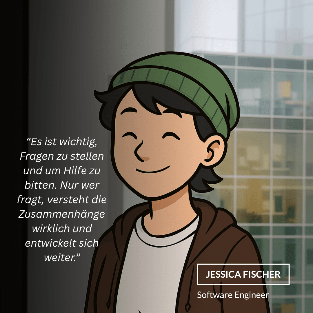 Ich habe gelernt, dass es nicht nur okay, sondern wichtig ist, Fragen zu stellen und um Hilfe zu bitten. Gerade im Arbeitsalltag lernt man am meisten durch den Austausch mit Kolleg:innen. Nur wer fragt, versteht die Zusammenhänge wirklich und entwickelt sich weiter.